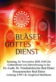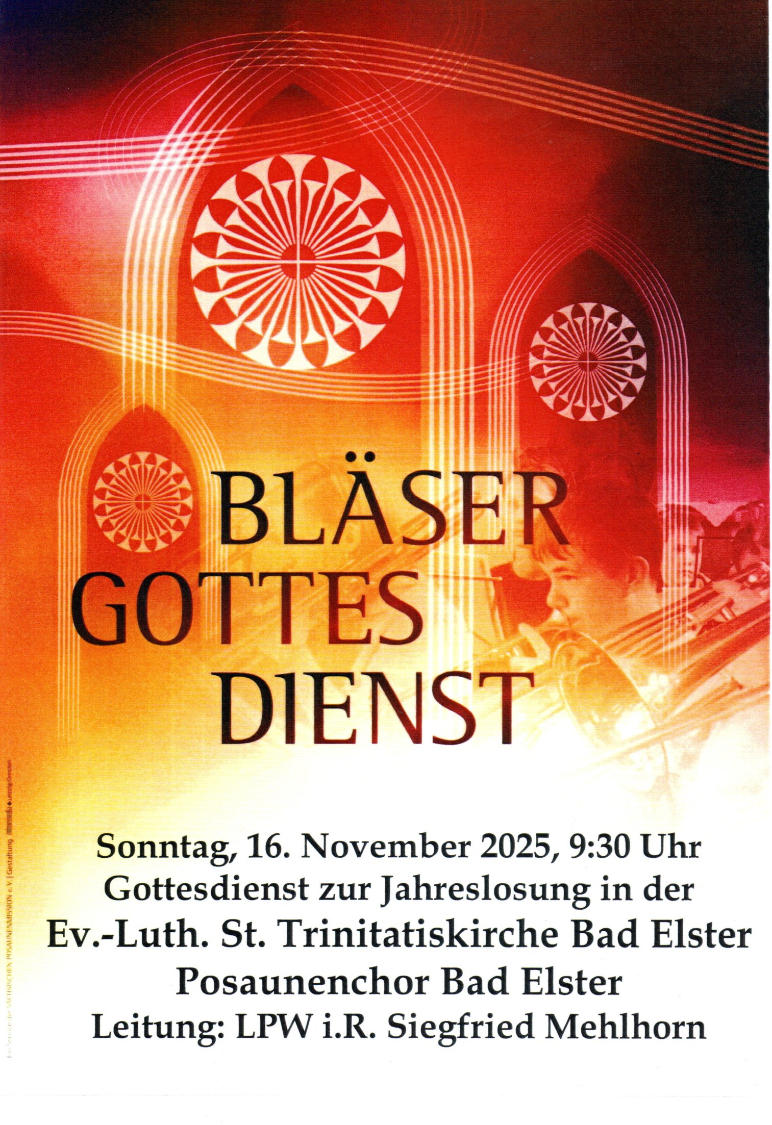 Am Sonntag, dem 16. November 2025 findet um 9:30 Uhr in unserer Ev.-Luth. St. Trinitatiskirche ein Bläsergottesdienst statt. Der Posaunenchor Bad Elster gestaltet unter Leitung von Landesposaunenwart i.R. Siegfried Mehlhorn diesen ganz besonderen Gottesdienst.