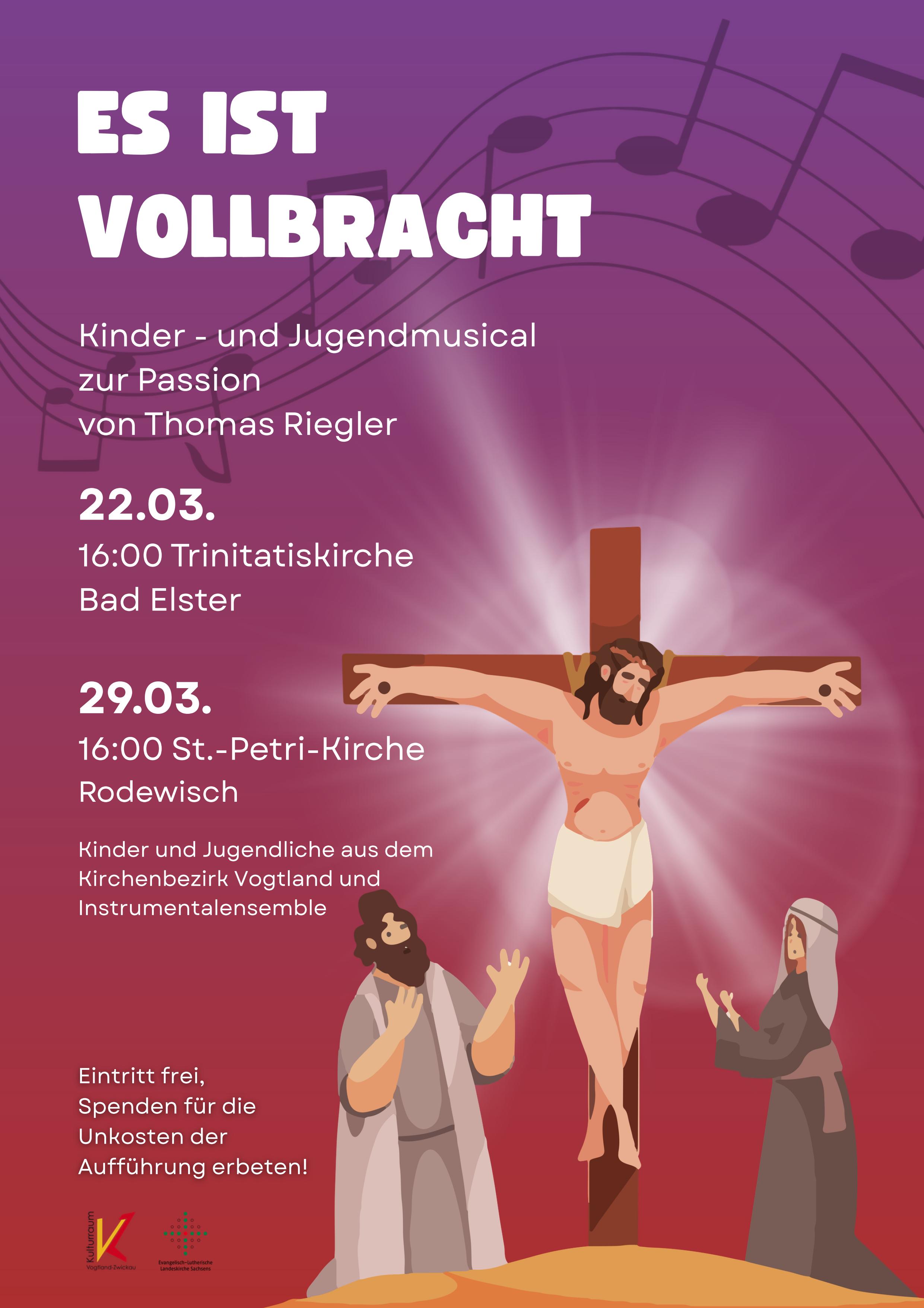 Gemeinsam mit der Kantorin von Auerbach, Daniela Meier, den Gemeindepädagogen von Bad Elster, Romy Wohlfarth und Auerbach, Elisabeth Arnstadt wollen wir das Passionsmusical „Es ist vollbracht“ einüben und in Bad Elster und Auerbach aufführen.