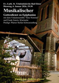 Im Namen der Kirchgemeinde und des Fördervereins Kirchenmusik Bad Elster wird ganz herzlich zur ersten kirchenmusikalischen Veranstaltung im Jahr 2026 am Dienstag, 6. Januar 2026 um 19:30 Uhr eingeladen.